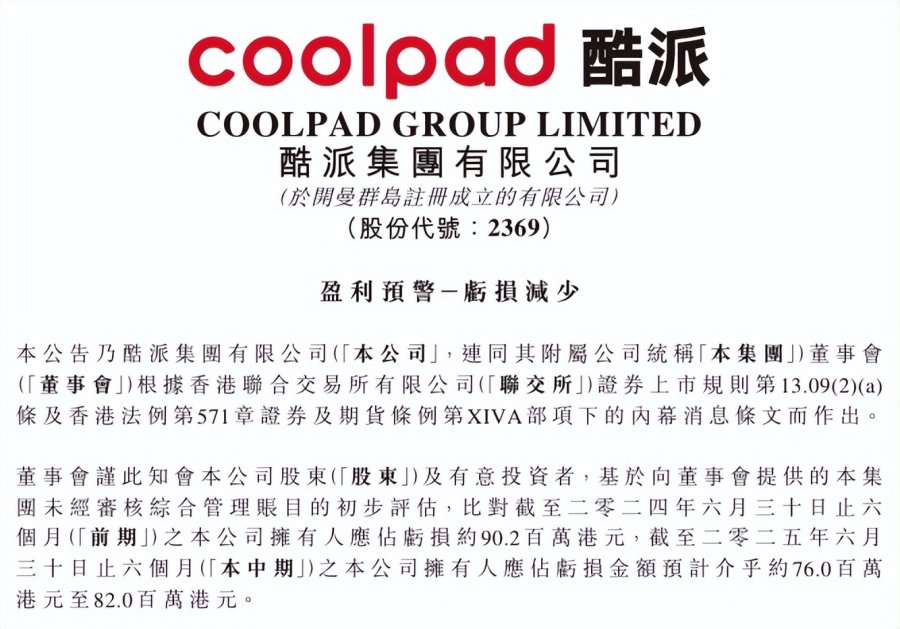 近日,酷派集团发布半年公告,预计2025年上半年公司拥有人应占亏损约为7600万至8200万港元。这一亏损幅度较2024年同期的9020万港元有所收窄。