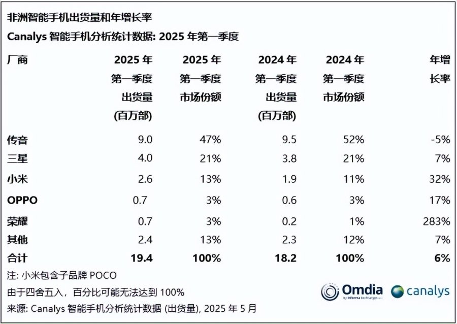 而在海外市场中,非洲智能手机增长迅猛。据市场分析机构Canalys数据,2025年,非洲智能手机市场迎来良好开局,区域出货量已连续第八个季度实现增长。仅2025年1季度,非洲智能手机市场的出货量就增长了6个百分点。