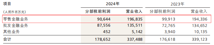 2024年,招商银行零售分部录得收入1968.35亿元,同比微增1.29%,但税前利润却背道而驰,同比下降9.28%至906.44亿元,相当于一年少赚约93亿元。