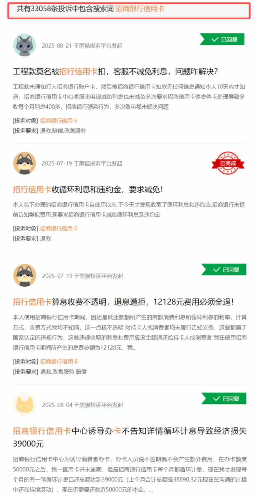 黑猫投诉平台上,输入“招商银行信用卡”关键词,出来的词条高达33000多条,在同业赛道遥遥领先,投诉集中在随意扣款、欺诈消费、息费过高、暴力电催、虚假宣传等问题。