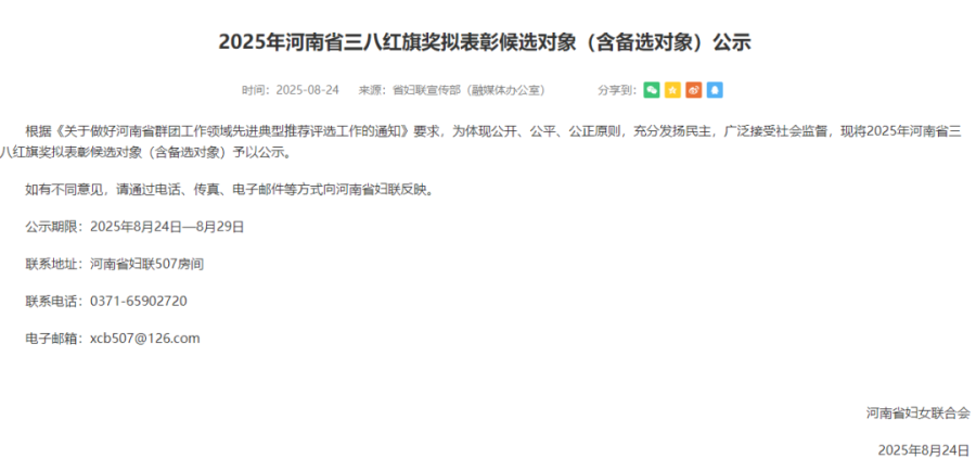 8月24日,河南省妇女联合会正式发布《2025年河南省三八红旗奖拟表彰候选对象(含备选对象)公示》,对拟表彰的先进集体与先进个人名单进行公示。