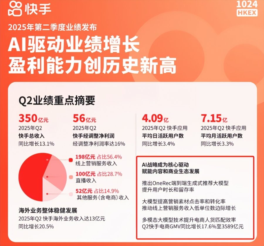 8月21日,快手发布2025年二季度财报,总营收同比增长13.1%至350亿元,经调整净利润56.2亿元,同比增长20.1%,营收、利润均远超彭博一致预期。