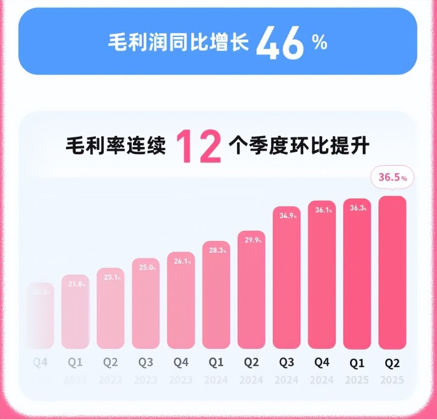 更关键的是,得益于AI技术对流程赋能,二季度其毛利率从去年同期的29.9%大幅提升至36.5%,且这已是其连续12个季度环比提升,对应毛利润同比增长46%,显示其经营质量的显著优化。
