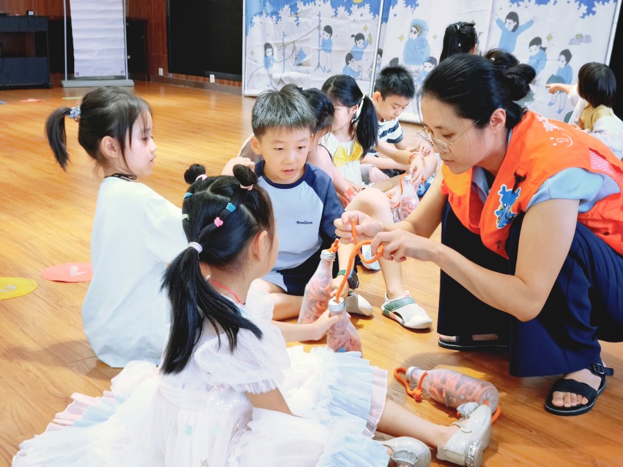 活动落幕之后,梓闻社工特意采访了参与的孩子,聆听他们的活动感受,收获了不少暖心反馈。一位孩子笑着分享:“这次的DIY抛绳器环节太有意思了!我之前从没琢磨过,用塑料瓶、绳子这些常见材料,居然能做出应急用的抛绳器。不光学到了实用的防洪知识,也锻炼了动手能力,掌握这些安全技能真的很重要!”其他孩子也表达了对此次活动的喜爱,其中一个孩子兴奋地说:“我最喜欢DIY防洪时装秀环节,在走T台环节我特别开心!”