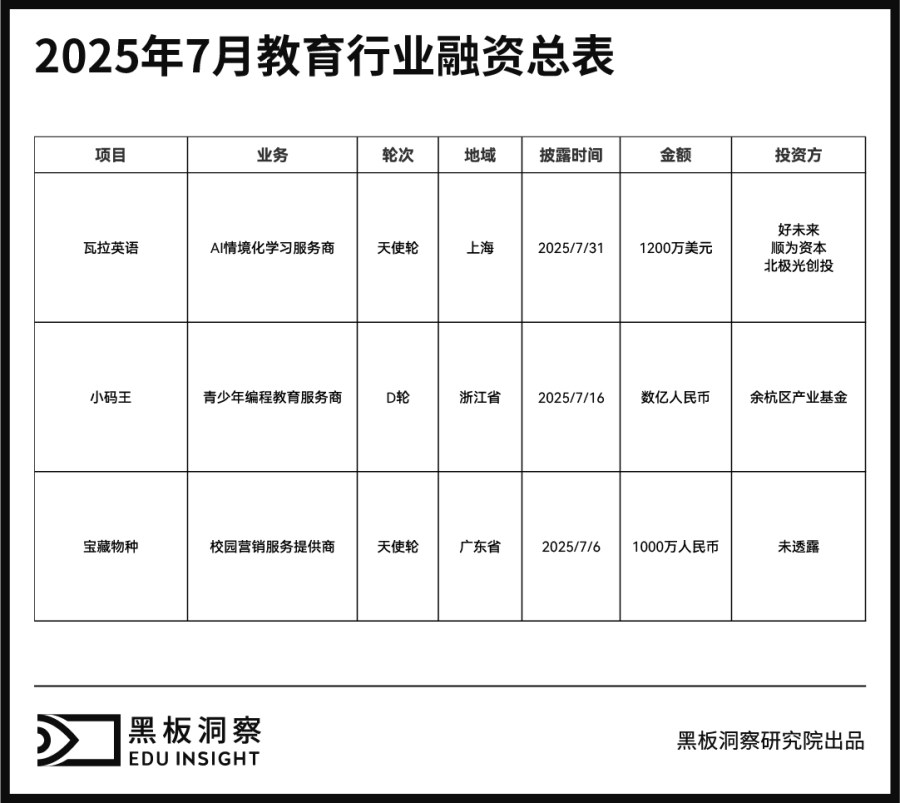 2025年7月教育行业共发生3起融资事件,融资总金额约为8200万人民币,分别为:近日,专注全流程AI情境化学习的瓦拉英语获得天使轮融资。据瓦拉英语创始人刘庆逊透露,北极光投资顾问(北京)有限公司、北京顺为创业投资有限公司以及好未来集团联合注资1200万美元。7月16日,少儿编程教育公司小码王完成D轮数亿元融资,投资方包括余杭区产业基金等政府性基金及资本市场机构。宝藏物种(上海)信息科技有限公司正式对外宣布,已成功完成 1000 万元人民币的天使轮融资。此次融资将成为企业发展的重要里程碑,为其在校园营销领域的战略布局注入强劲动力,进一步深化在年轻消费市场的开拓与耕耘。