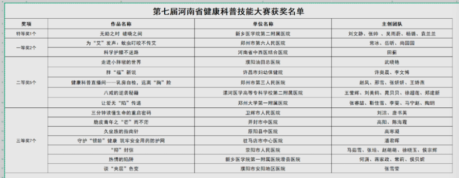 记者从河南省卫生健康委获悉,经过近5个月的层层选拔,第七届河南省健康科普技能大赛圆满落幕,最终共有15部优秀科普作品从全省3524部作品中脱颖而出,分别捧得大奖。