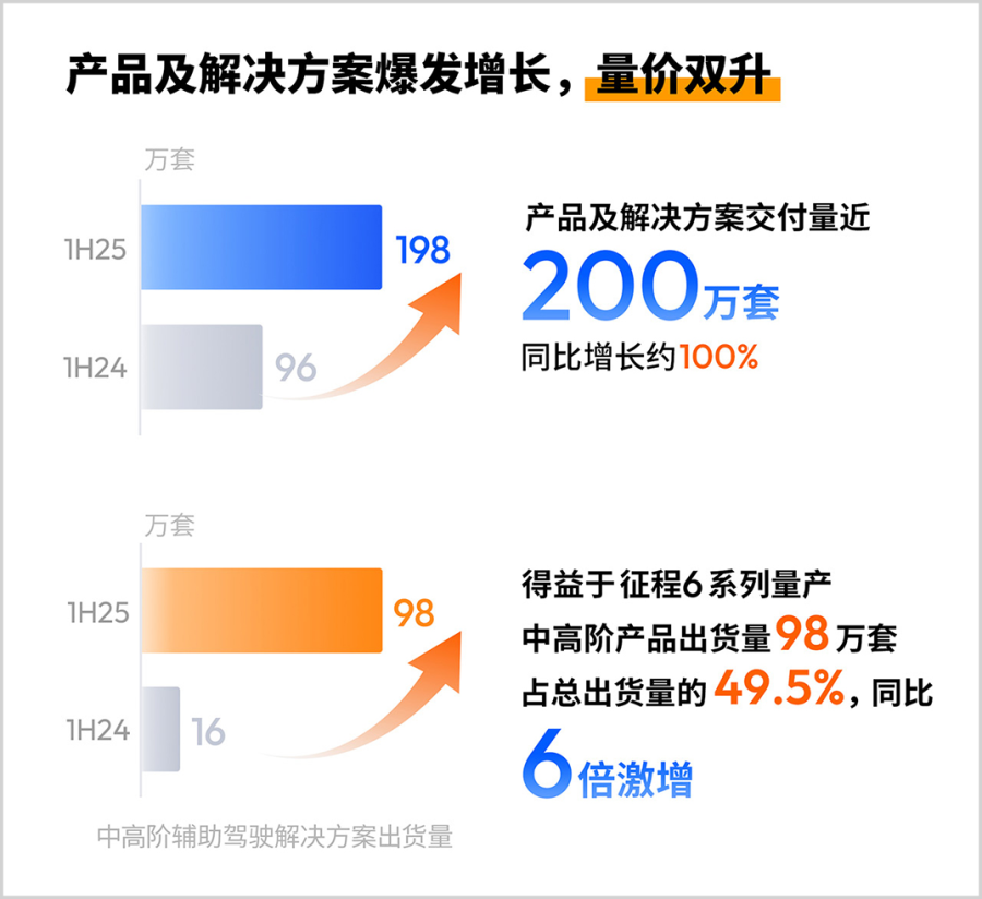 今年上半年,公司中高阶产品解决方案(如支持高速NOA功能)出货量98万套,较去年激增6倍,目前在总出货量中的占比已接近50%,此番产品结构升级直接推动公司单车价值量提升到去年同期的1.7倍。