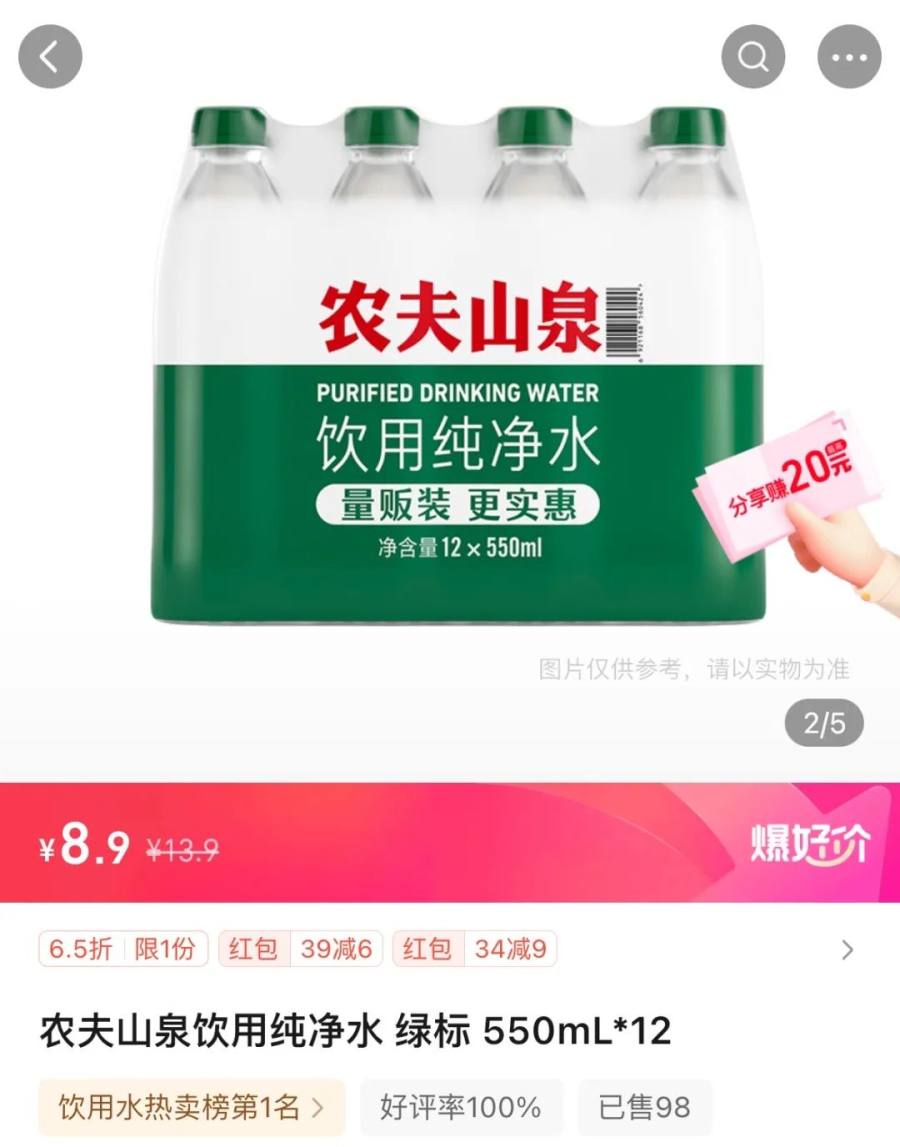 去年4月重启绿瓶纯净水,本是应对包装水下滑的应急方案,以低价撕开缺口。价格战最激烈时,绿瓶纯净水终端定价低至1元/瓶(单瓶装)、8.9元/件(12瓶装),折算单瓶单价不足0.75元。