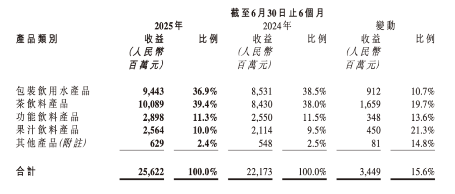 业务爆发下,茶饮料首次突破半年百亿关口,以100.89亿元的营收同比增长19.7%,营收占比攀升至39.4%,正式超越包装水(营收94.43亿元,占比36.9%),成为集团第一增长引擎。