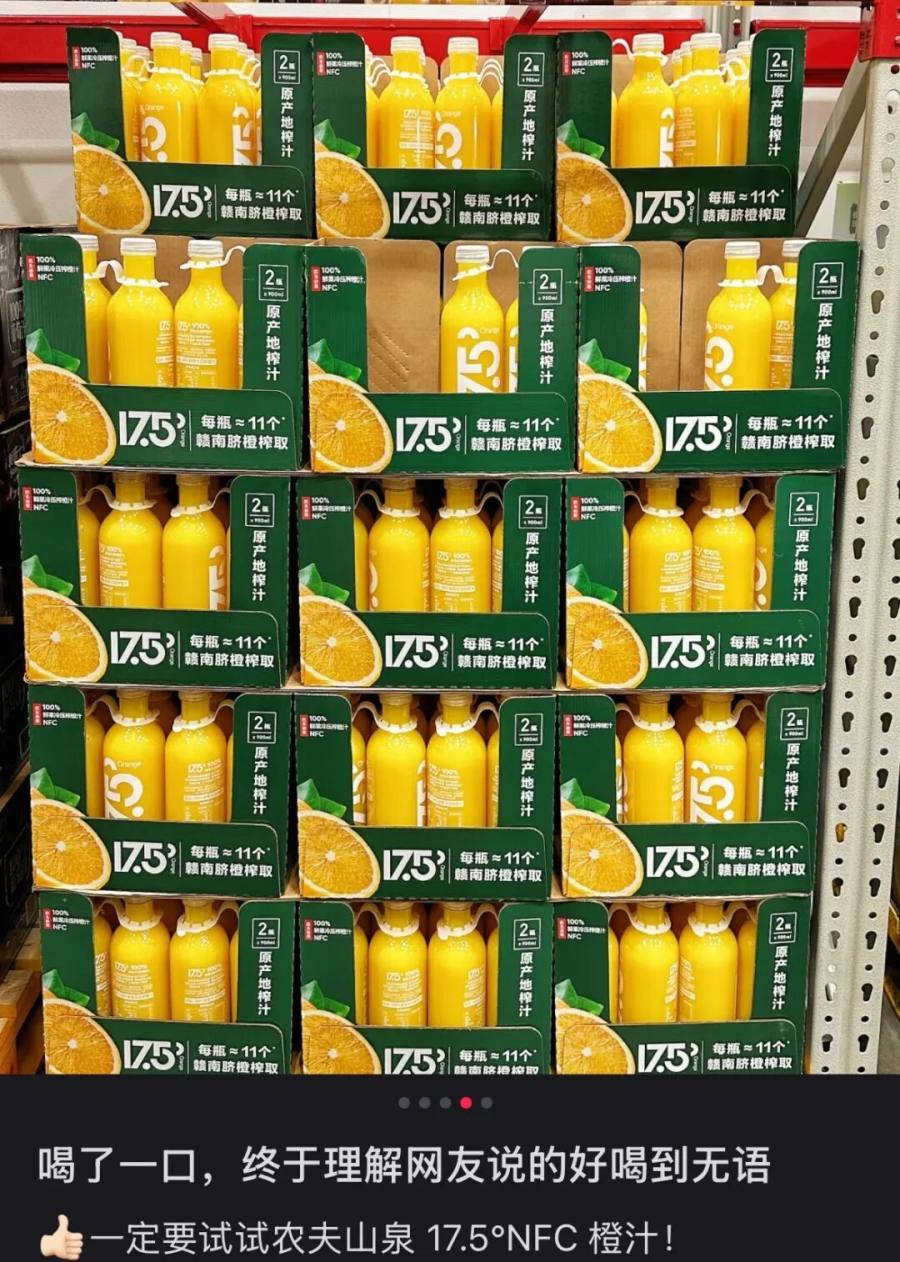 2024年底与山姆的合作,是农夫山泉果汁业务最亮眼的“局部突破”,将17.5°NFC橙汁引入高端商超,凭借“冷压鲜榨”“每瓶11个赣南脐橙”的标签,这款950ml/2瓶定价39.90元的产品,上半年成为山姆瓶装果汁热销单品。