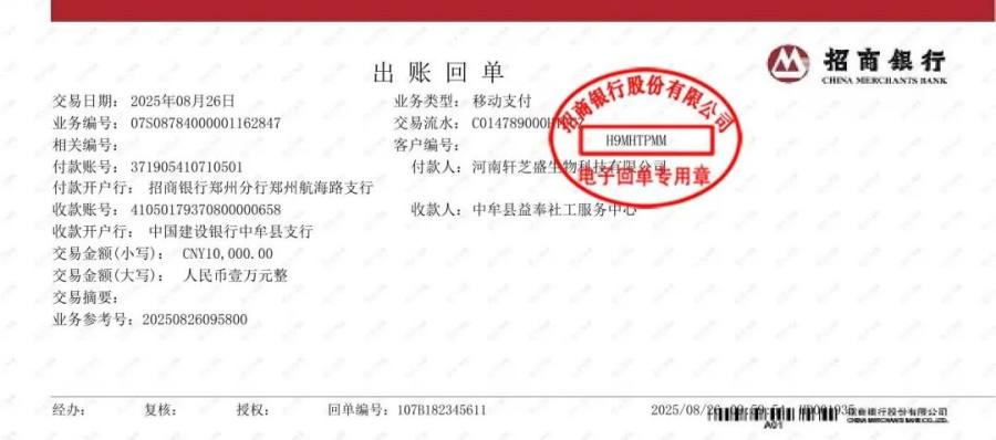 据悉,河南轩芝盛生物科技有限公司曾于2024年11月3日向中牟县益奉社工服务中心捐赠3000元。