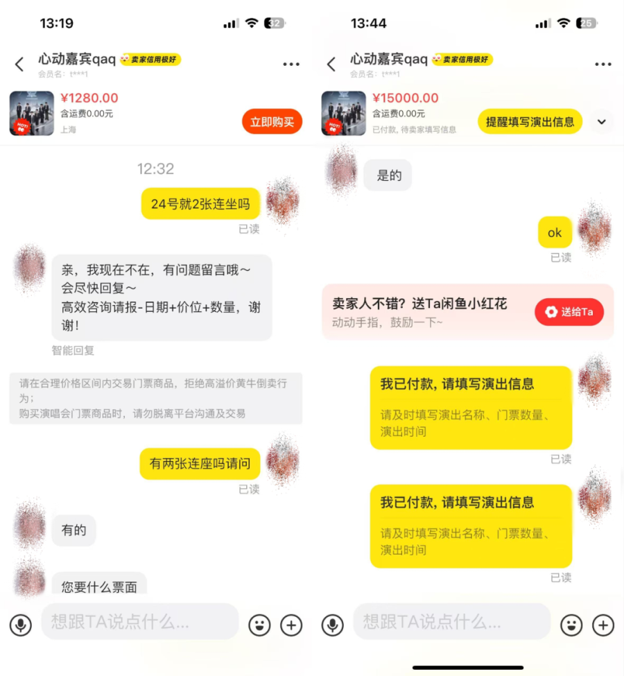 小邵的爸爸在8月21日已经让女儿看过原价场。考虑到这场的位置比较偏,他又在24日花了1.5w元,找黄牛录入包厢票,给小邵准备了“小惊喜”。他觉得溢价的范围还在自己的接受范围内,而且贵在“连座”,自己也可以陪伴女儿一起看喜欢的偶像。