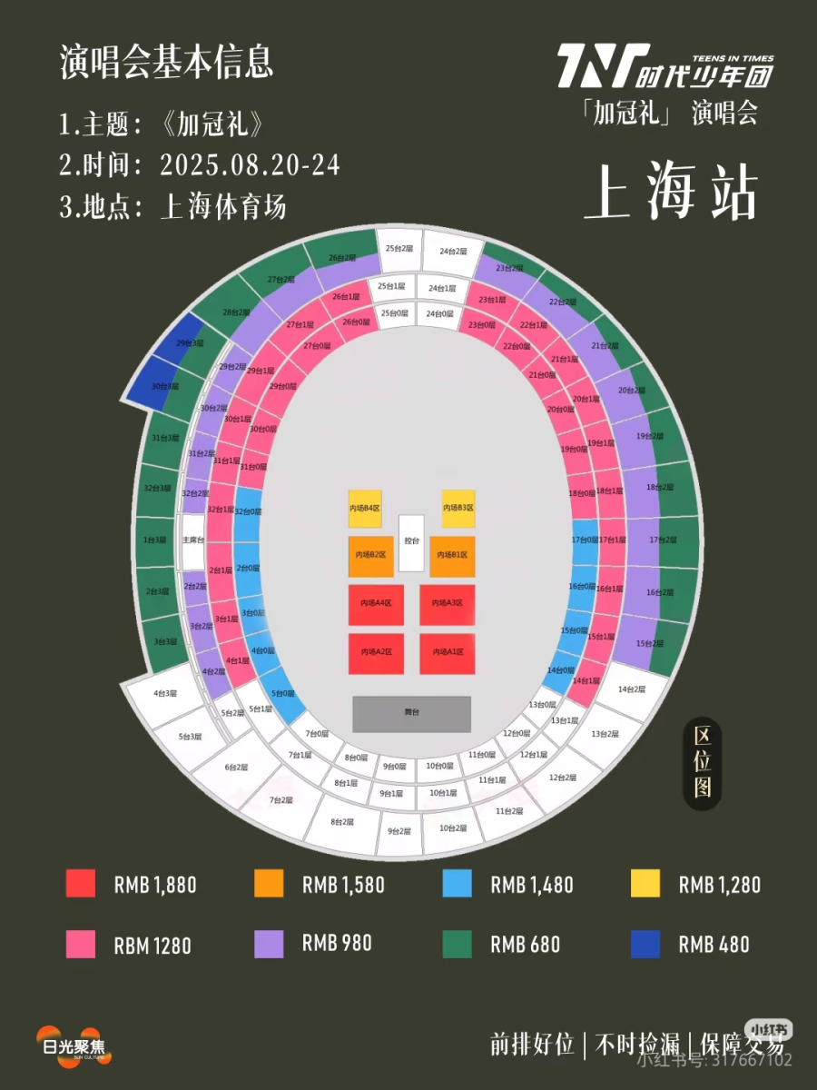 不同的成员的粉丝,还有自家的强攻区、主攻区和副攻区。有粉丝在抢到随机的座位后,去微博、小红书等其他社交媒体平台换票,和大部队坐到一个区域,方便摆阵。还有很多粉丝使出冲刺800m的力气,第一批抢占演唱会栏杆,并在上边缠上自家胶带,宣示主权。