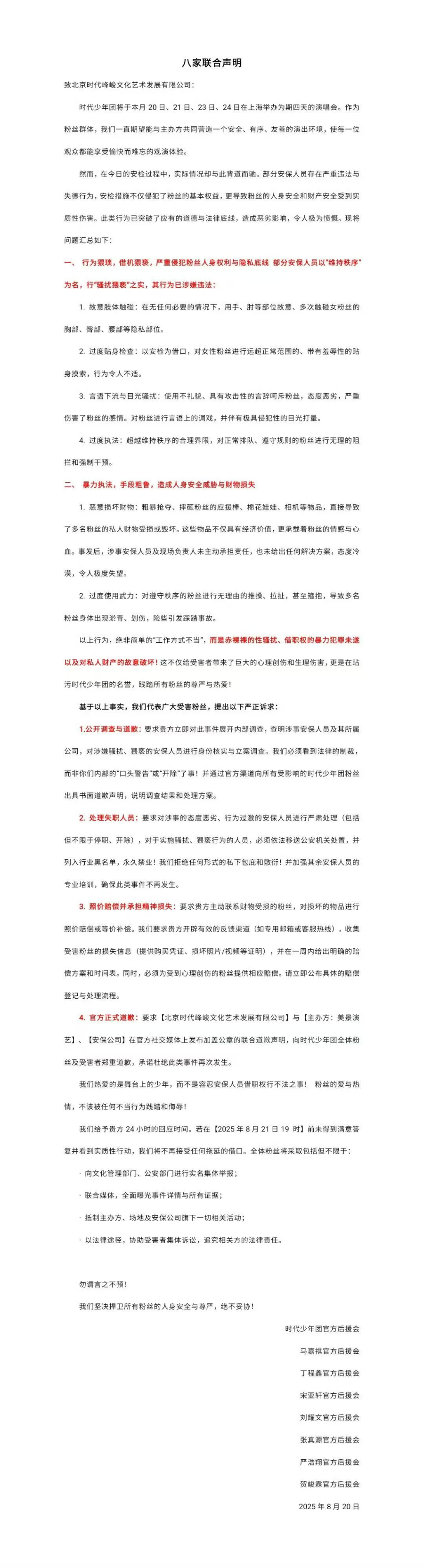 8月20日晚7点,时团后援会官博发布《八家联合声明》,认为部分安保人员存在违法与失德行为,侵犯粉丝权益。声明还列举了现场出现的问题,以及提出了严正诉求。但后援会随后删博。