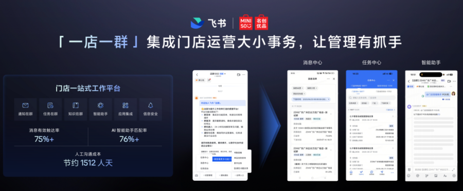 飞书构建的“店群”一站式平台,统一聚合了通知、任务、知识、智能助手和应用,支持开闭店和人员管理自动化。