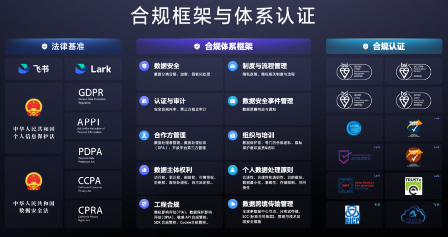飞书就是一部“出海合规宝典”。它是目前国内市场里合规认证做到最好、最全的,拿到中国的认证之外,还覆盖了欧美、东南亚、拉美在内的主流市场标准。而且,飞书的数据存国内,Lark(飞书海外版)的数据存海外,既高效又符合各地合规要求。
