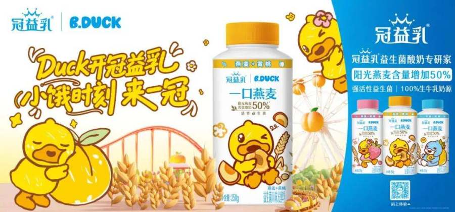 不仅如此,冠益乳与潮流IP B.DUCK的联名合作,以“一口燕麦”系列成功实现品牌破圈。通过包装视觉焕新与配方健康升级,该系列不仅在社交平台引发自发晒图热潮,有效提升了品牌年轻化声量,更显著拉动了终端销售转化。