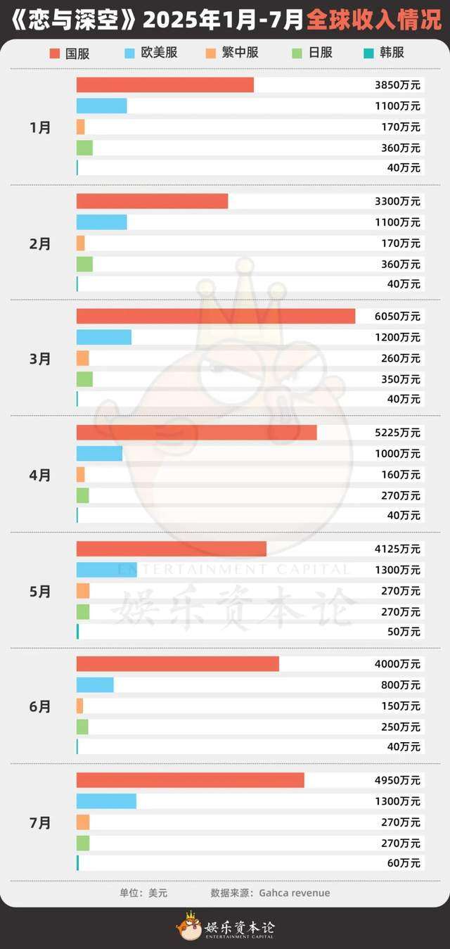 从数据端情况来看,2024年1月18日《恋与深空》公测上线,一直到去年9月份,日服都是除了国服之外,氪金意愿最高的地区,但从去年下半年开始欧美服突然发力,流水从第三上升至第二,有时候甚至能够倍杀日服。
