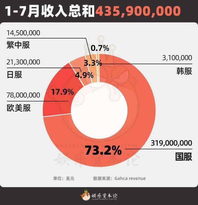 在去年一年的总收入统计中,《恋与深空》在全球狂揽近60亿人民币,其中海外市场占比达36%,包括繁中(港澳台)服、日服、韩服及欧美服。小娱则统计了今年1-7月《恋与深空》全球收入情况,发现欧美服以17.89%收入占比排在第二位。