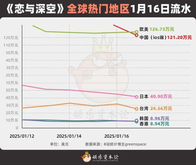 一般来说,女性向游戏出海表现最优的市场,当属已经经历过氪金教育且文化背景与中国都更贴近的日本,网易旗下的好几款女性向游戏,就是在日本市场表现不错。然而,打破认知的是,《恋与深空》海外收入最高的地区,并非日本或韩国,而是看起来“难攻难守”的欧美市场。在今年的1月16日,甚至出现了欧美服单日收入超过国服IOS端这么“倒反天罡”的情况。