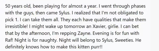 Oliva说,自己最初确实是因为Rafayel入坑的,因为他的性格很温柔,“保镖小姐”的称呼也很能激起她的保护欲。可是当去年“反派男主”秦彻上线后,她无法自控地变心了。