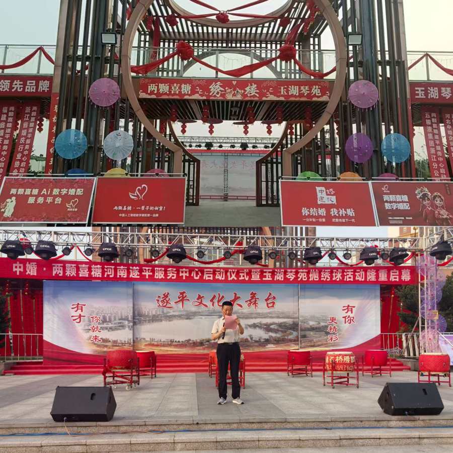 仪式环节中,驻马店市服务中心主任率先致辞,传递对遂平服务中心的期待;随后,浙江中婚控股集团副总裁李喜年、遂平县车伍家具超市有限公司(全友家居)遂平县身边好人协会会长车艺军共同完成授牌剪彩,标志两颗喜糖遂平服务中心正式落地;驻马店市遂平县服务中心主任分享服务中心规划与愿景,明确为单身群体提供优质婚恋服务的目标;江琴江总则阐述抛绣球活动策划与发展规划,为后续活动铺垫。
