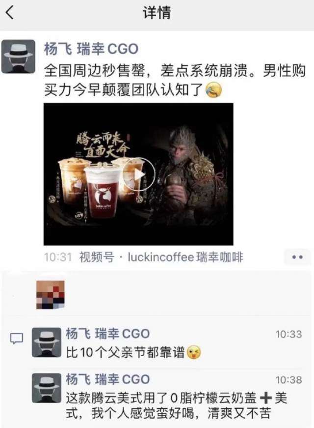 数据最有说服力,2024年瑞幸全年联名达37次,2025年上半年亦有10次左右,每一次合作都精准踩中大众关注度。其中杨飞主导的瑞幸 ×《黑神话:悟空》联名,推出腾云美式及限量周边,首日便售罄并冲上热搜,他当时还在朋友圈感叹 “差点系统崩溃。”