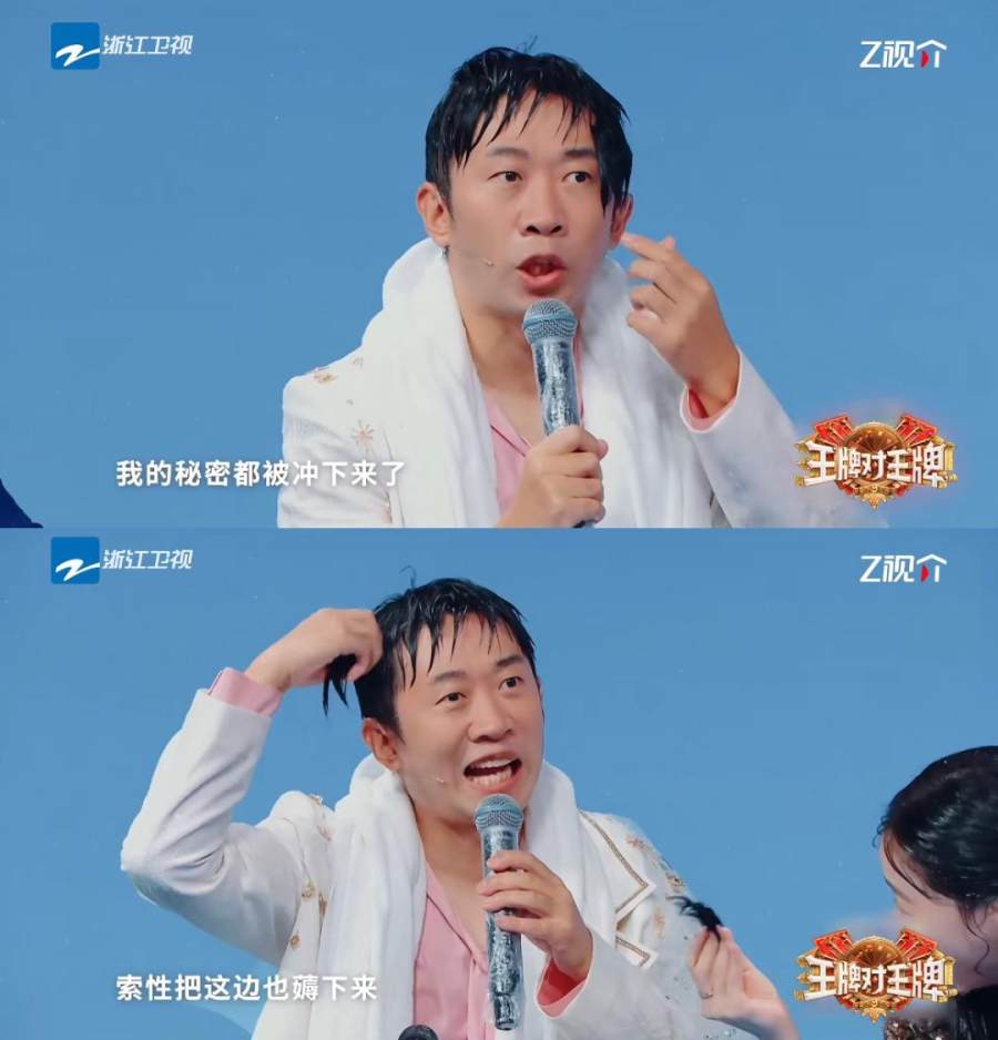 老粉熟悉的“高密度笑点”没丢,游戏还是坚持简单易参与的原则。第一期的“禁语发布会”,不用复杂规则,就靠“说禁语被浇水”的惩罚,让沈腾直接化身顺产头“旺仔”,让杨迪被浇到假发脱落,金靖的靴子里能倒出水。笑点直接且密集,每一帧都是表情包。