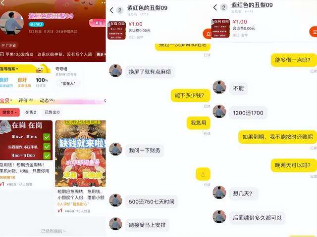 随机联系一位昵称为“出云数码”的闲鱼用户,对方公开表示:“苹果16全款可以借1000元,七天后还款1300元;借1300元需还1750元;若借2000元,七天还款为3000元”。即便对方主动提出可补贴100-200元红包以示“利息高”,其实际年化利率依然远超国家允许的36%红线,构成典型高利贷。