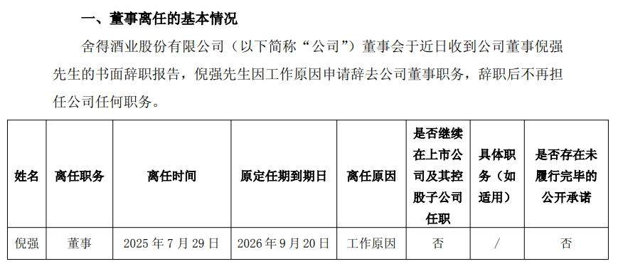 7月29日,舍得酒业发布公告称,倪强因工作原因申请辞去公司董事职务,辞职后不再担任公司任何职务。其原定任期本应至2026年9月20日结束,这一提前离职再次引发了市场的诸多猜测。