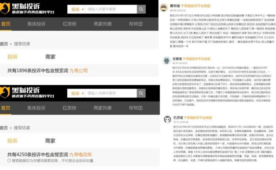 截至8月26日,黑猫投诉平台上,涉及关键词“九号公司”的相关搜索共有1896条,涉及关键词“九号电动车”的相关搜索有4250条,主要集中在售后没保障、服务态度差、产品质量差、虚假宣传、电池损坏等问题。