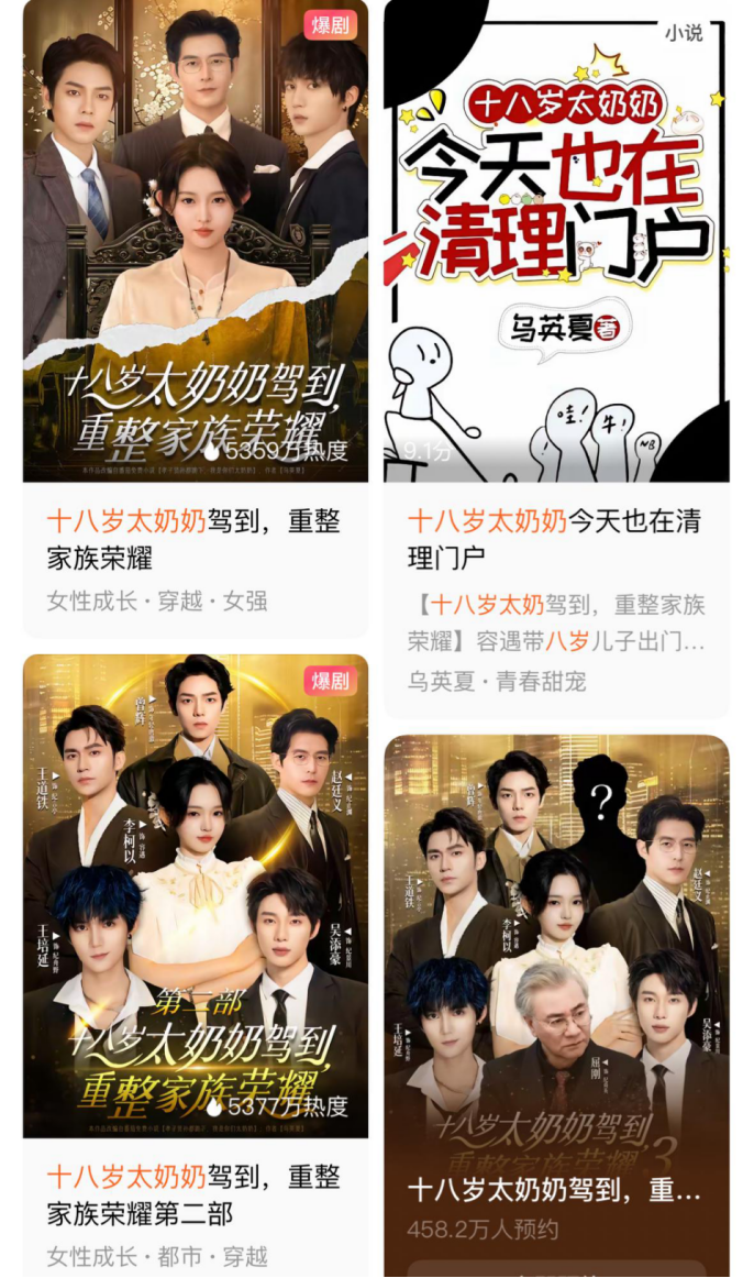《云渺》播出四季,《十八岁太奶奶》续季热度破亿创记录,曾经的榜一《老千》《乡下真千金竟是老祖宗》《郡主十岁》《寒门小状元》都推出了续季。