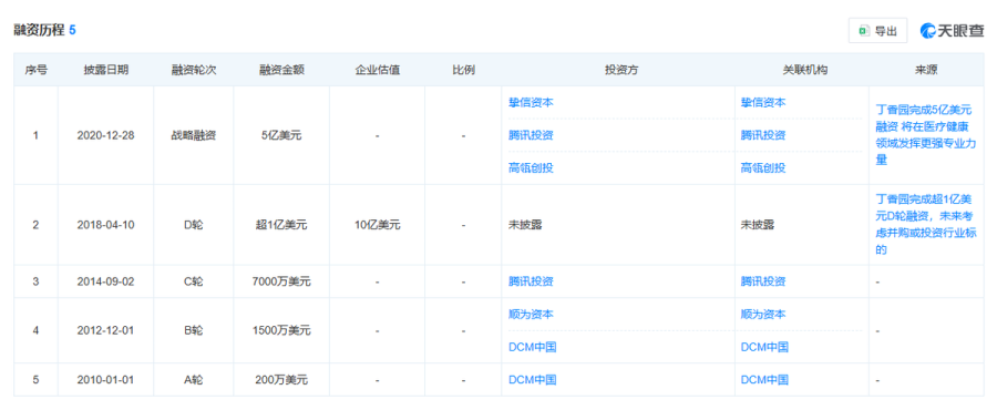 2020年,丁香园宣布完成5亿美元(约合人民币32.67亿元)融资,本次融资由挚信领投,腾讯、高瓴创投两家机构跟投。