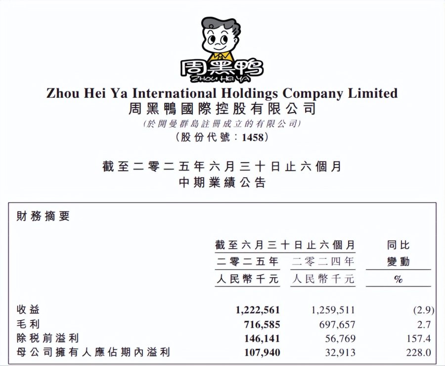 近日,周黑鸭(01458.HK)发布2025年上半年业绩报告。报告期内,公司实现营收12.23亿元,同比减少2.93%;实现净利润1.08亿元,同比增长228%。