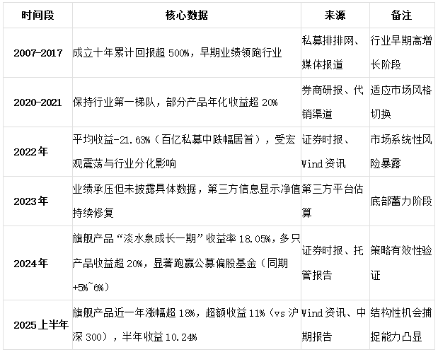 淡水泉(北京)投资管理有限公司作为国内成立时间早、知名度高的百亿级私募证券基金管理人,自 2007 年成立以来,始终以 “基本面驱动的逆向投资” 为核心策略,业绩呈现显著阶段性特征。早期凭借卓越长期回报奠定行业地位,近年虽受市场环境影响经历波动,但 2024 年起业绩回暖趋势明确,2025 年上半年延续向好态势,整体展现出较强的策略适应性与业绩修复能力。