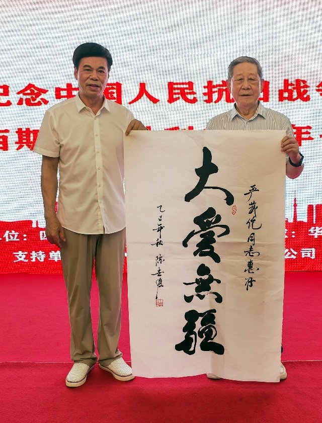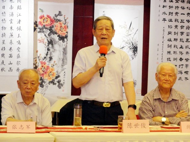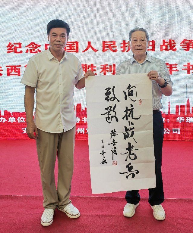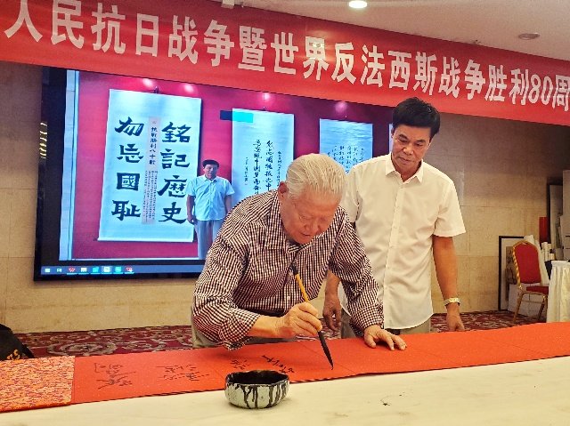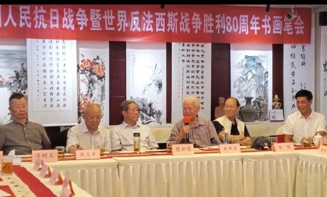 省老领导陈世俊致辞并宣布书画笔会正式开始。陈世俊在致辞中表示,今天,我们怀着无比激动的心情,相聚在纪念中国人民抗日战争暨世界反法西斯战争胜利80周年的书画笔会活动现场,隆重纪念那场经过艰苦卓绝,付出重大牺牲取得的伟大胜利。80年前的今天,正义与胜利的钟声在全球敲响;80年后的此刻,和平的阳光照耀着祖国壮丽河山。为此,我们决不能忘记80年前对中国人民带来深重灾难的日本侵华战争,决不能忘记在那场战争中英勇献身的先烈。请允许我代表全体与会者,向在抗战中英勇牺牲的英烈、向所有为世界反法西斯战争献出生命的仁人志士,致以最深切的缅怀与最崇高的敬意!