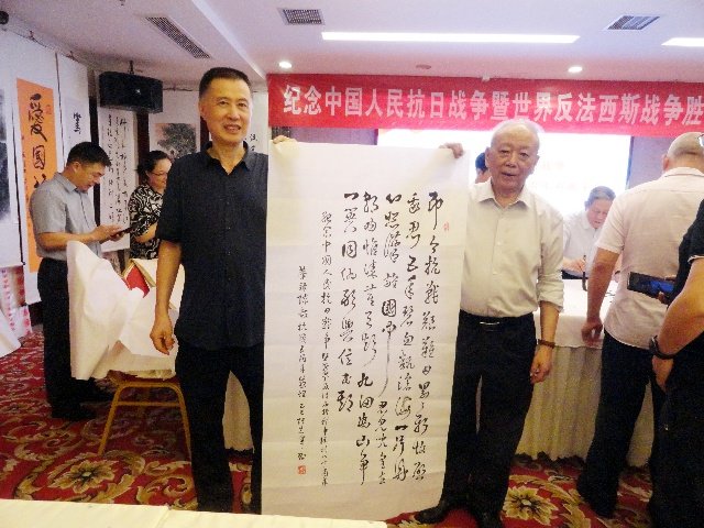 还有一些书画家自创了诗歌,从而让诗书画三种艺术形式在同一作品中同时出现,相映生辉,相得益彰。但无论书画家们采用的何种艺术表现形式,但始终都围绕“抗战”主题来创作,形式多样,主题鲜明,意涵丰富。真可谓纸上山河,笔墨如神。(记者刘昕 摄影报道)