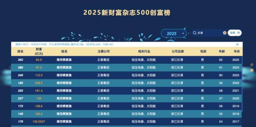 值得一提的是,南存辉家族是今年榜单中唯一一家公司总部位于浙江乐清的富豪。这也就意味着,若以企业总部所在地为界定标准,南存辉家族是浙江乐清的首富。