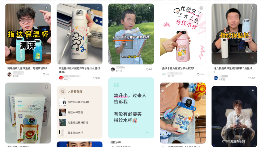 于是在家长的视角里,一边看到的是新闻报道里的学生饮水安全问题,让家长产生焦虑,另一边又是铺天盖地案例、测评儿童指纹水杯的社交媒体内容,为家长们提供“解决办法”。