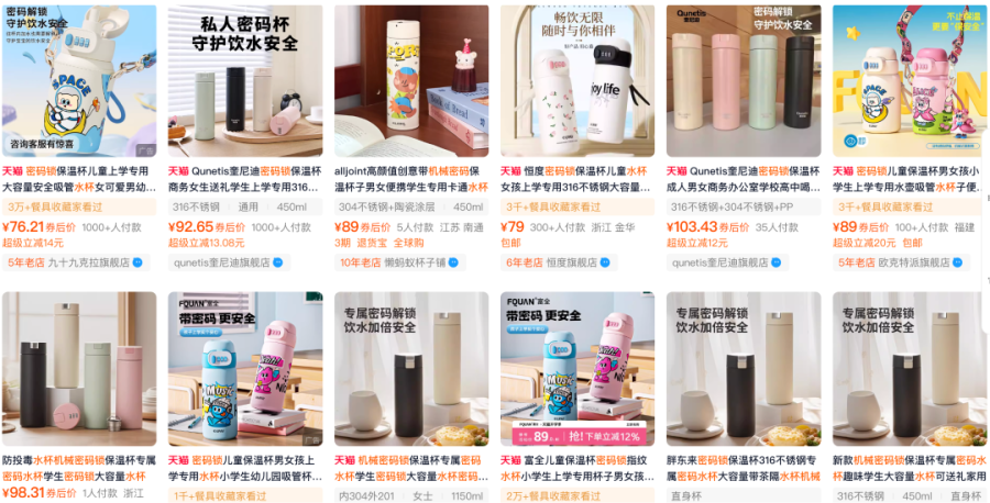 惊蛰研究所在电商平台搜索发现,目前网络平台在售的儿童指纹水杯,核心价格带在200元-400元,个别产品售价能够达到上千元,不带指纹解锁功能的儿童保温杯售价则在200元以下。