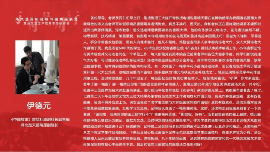 《中国故事》杂志社原副社长、原湖北楚天画院伊德元副院长回忆道:汤老师是我国著名的书画大师,其名作涉及人物山水,花鸟書法無所不精,构思新颖,技巧精湛,筆墨洒脱,特别是70年后期的创作更彰显其高超中国画技巧!汤老平易近人,群众非常喜欢他的画…他对学生作品总是热情指点。有次他给我画上题款,赢得现场观众赞美;当晚汤老又对我画上不足耐心点评、示范。汤老德艺双馨的艺术教育家形象我们终生不忘。