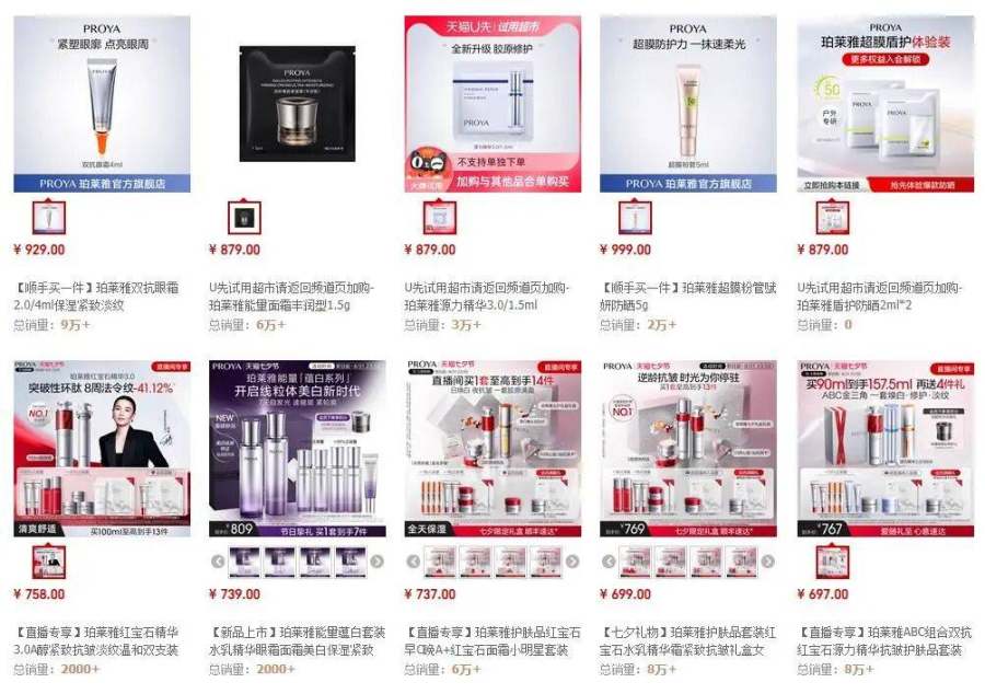 反观竞争对手。以珀莱雅为例,在珀莱雅的天猫旗舰店中,价格在500元以上的产品数量是自然堂的约四倍,其中有将近一半的产品销量过万。