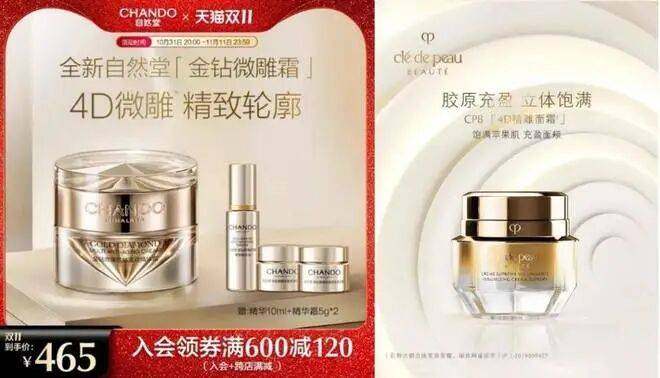 其金钻微雕面霜的外观和命名,被外界质疑似有“借鉴”CPB的痕迹——两者不仅外观、颜色相似,推广名4D微雕、4D精雕也只有一字之差。