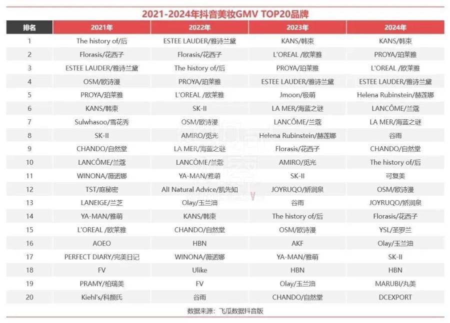 虽然在2024年又重新创入前10,但已经可以看出远不如珀莱雅、韩束等品牌有后劲儿。