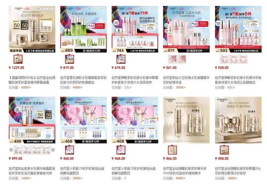 在天猫自然堂官方旗舰店,自然堂单品价格超过500元的产品不过寥寥几款,总销量过万的更是屈指可数。