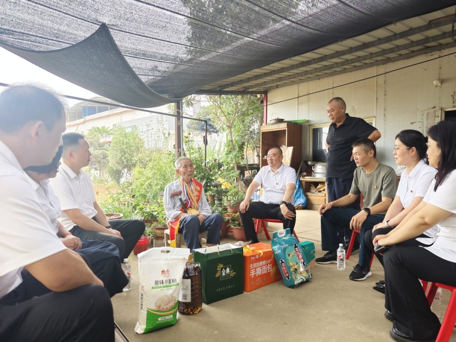“你们是国家的英雄和功臣,今天我们来看望你,向你表示敬意!”上午10时30分许,黄永杰一行带着慰问品赶到该县源潭镇马湾村98岁的抗战老兵简新义家中看望慰问,精神矍铄的简新义老人抚摸着胸前的军功章激动地说:"当年我们参加抗战、打鬼子,为的就是赶走侵略者,让子孙后代不再受战火之苦。现在国家富强了,要珍惜来之不易的和平!"黄永杰紧握老人双手:"希望你多注意身体。你们抗战老兵们的英勇事迹让大家明白,今天的幸福生活是无数先烈用生命换来的,这种幸福和和平我们必须珍视和守护好。我们会在保险岗位上继续努力,把国家和生活建设得更好......"