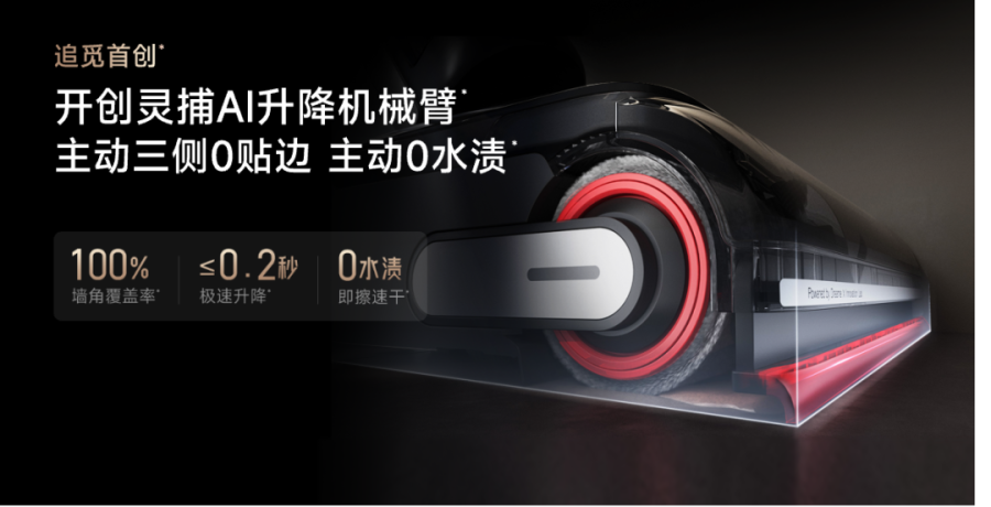 去年,追觅洗地机就以一项名为“灵捕AI升降机械臂”的颠覆性技术,开辟了一条新路,将行业正式带入“机械臂1.0时代”。彼时,追觅发布的T40 Ultra首次实现“眼+脑+手”协同——通过方向识别模组、AI算法与高精度舵机,完美模拟人类的清洁逻辑。