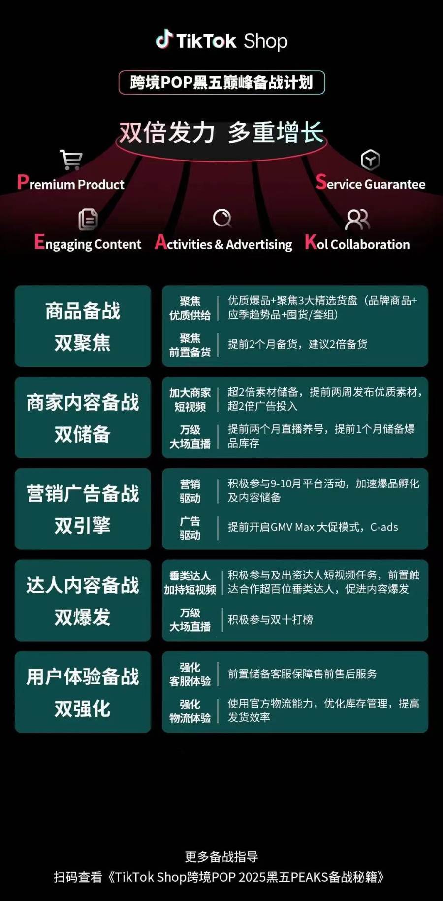 在旺季来临前,商家若想抢占爆单先机,实操关键在于通过好内容吸引用户,以好商品满足需求,凭借好服务让用户满意,借助好营销提升影响力,是此次黑五大促狂欢的“生意加速器”,也是在黑五等重要促销节点实现营销最大爆发的关键。基于这一思路,TikTok Shop跨境电商推出了“PEAKS黑五巅峰备战计划”。