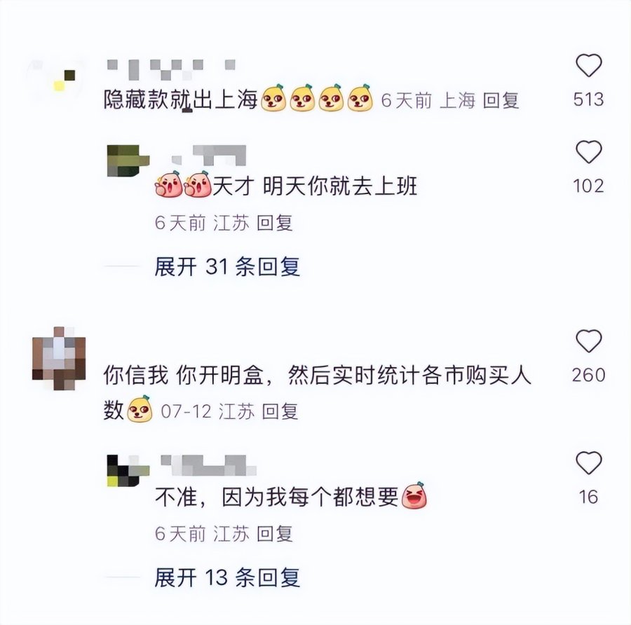也有不少网友就着盲盒开始玩梗,“开明盒,然后实时统计各市购买人数”、“散装江苏,太会玩了”、“隐藏款南京(京爷版)”。