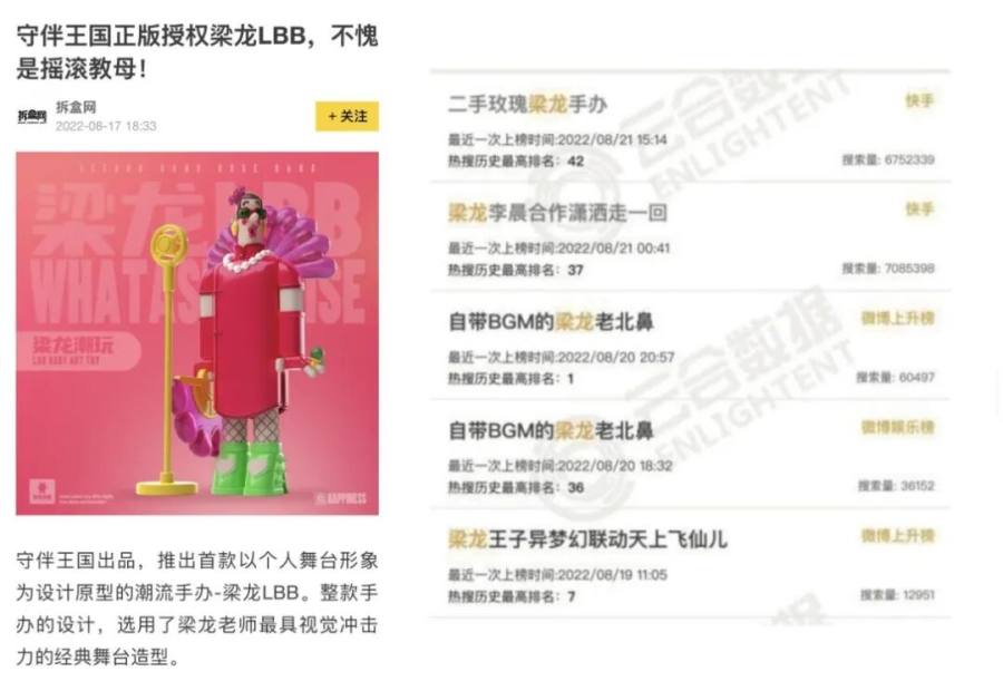 提到守伴王国,很多业内人并不陌生,该公司成立于2021年,此后持续与北京国际电影节、大学生电影节等知名IP合作官方衍生品。2022年推出的以二手玫瑰主唱梁龙为原型的潮玩手办“梁龙LBB”,就多次登上热搜,还亮相在《乐队的夏天》等热门综艺。